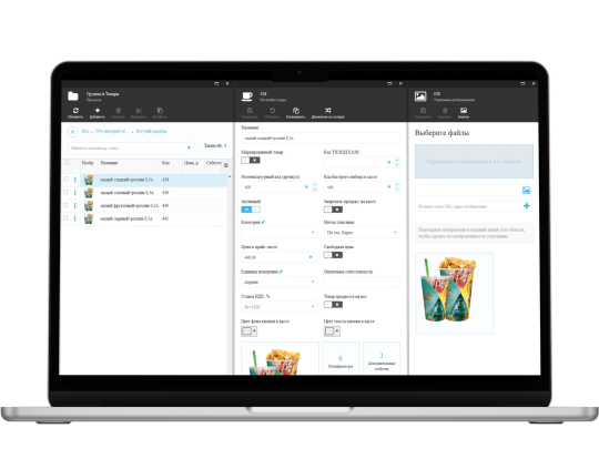 Создание технологических карт и модификаторов, информация о движении товаров. Складской учёт, быстрое меню для кассира, журнал кассовых смен. История хозяйственных операций и взаиморасчётов.