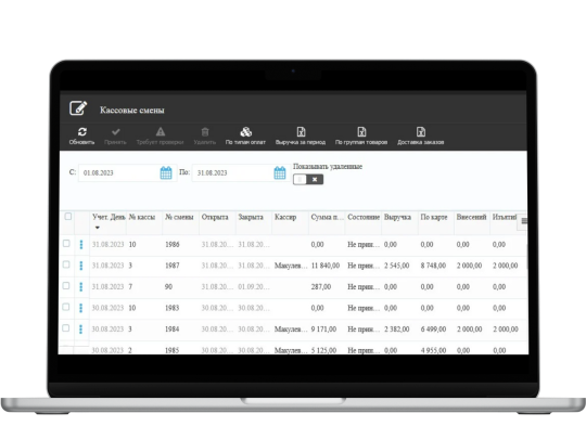 + смены, размен, технологические карты, отчёты по смене, расход товаров, выдача заказов онлайн и др.